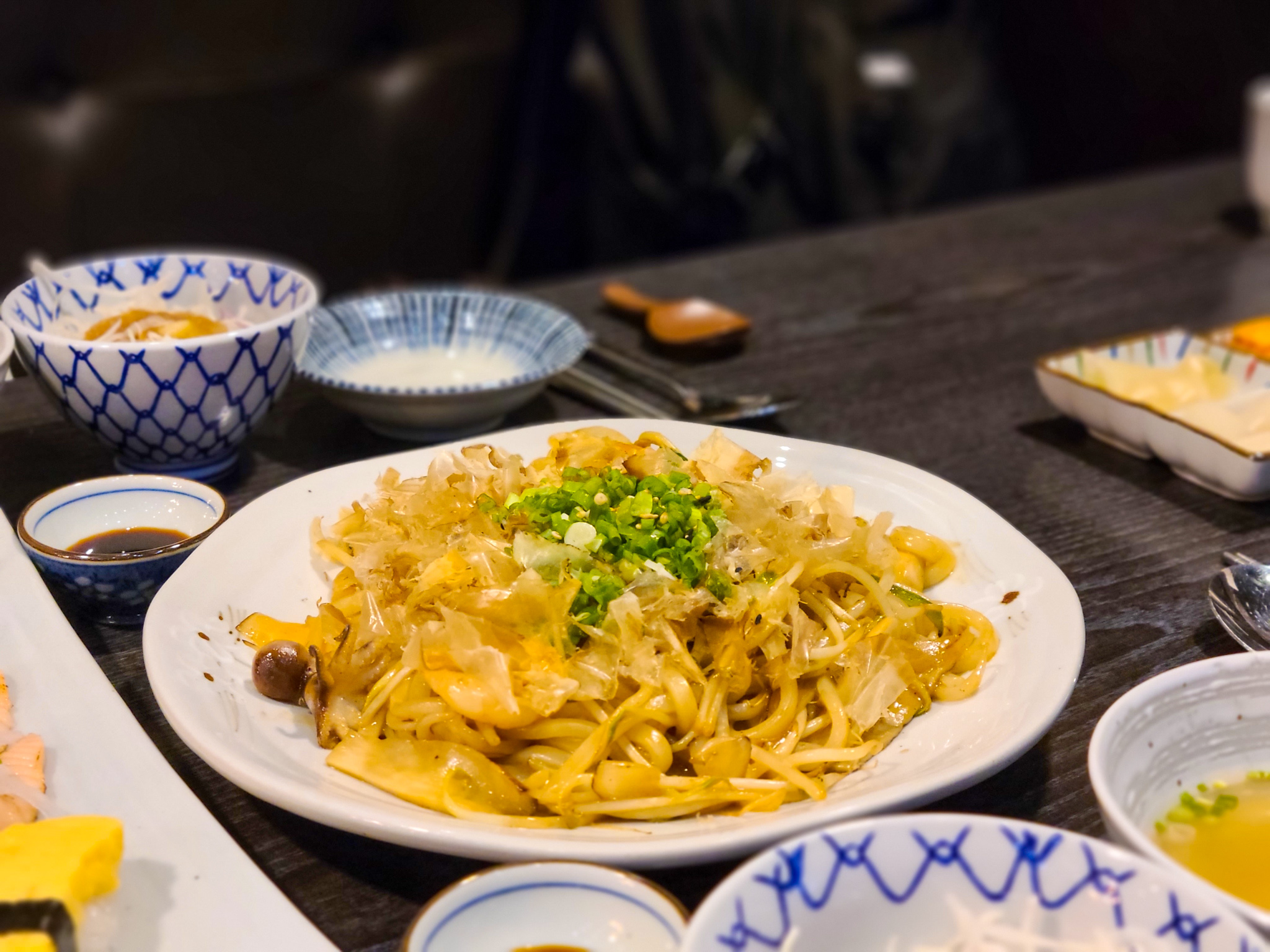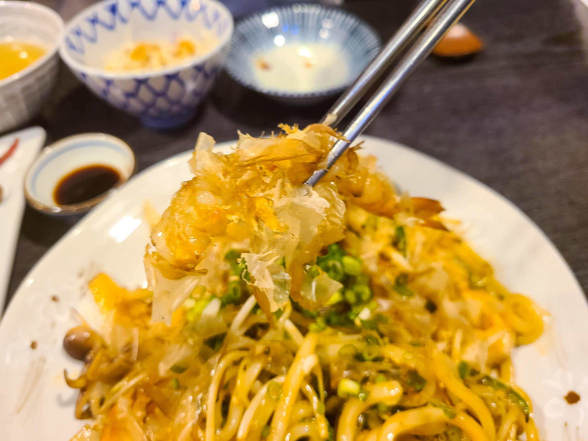 먼저 해물야끼우동 입니다. 해물야끼우동 위에는 가쓰오부시가 듬뿍 올라가있고, 맛있는 해물도 여러 종류 들어있습니다.