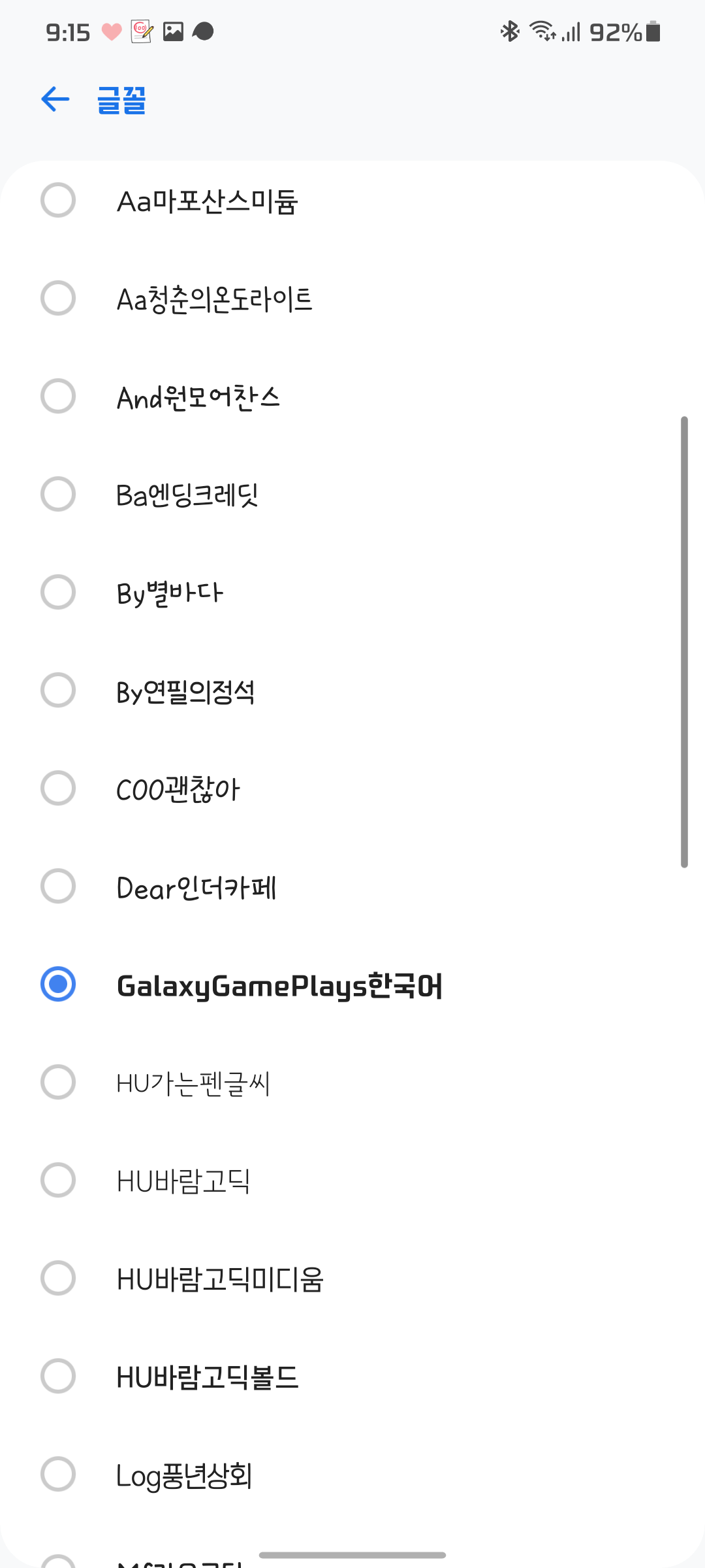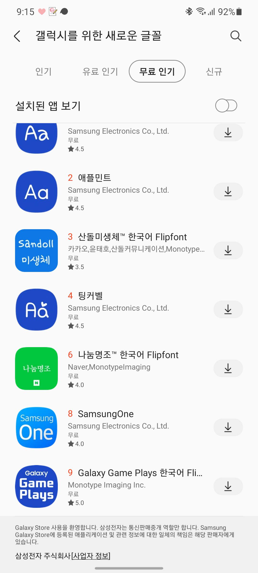설정 - 디스플레이 - 글자 크기와 스타일 - 글꼴 - 글꼴 다운로드(맨 아래쪽) - 무료 인기 로 들어갑니다. 다양한 무료 폰트가 뜨게 되는데 이중에서 'Galaxy Game Plays 한국어 Flipfont' 를 눌러줍니다.