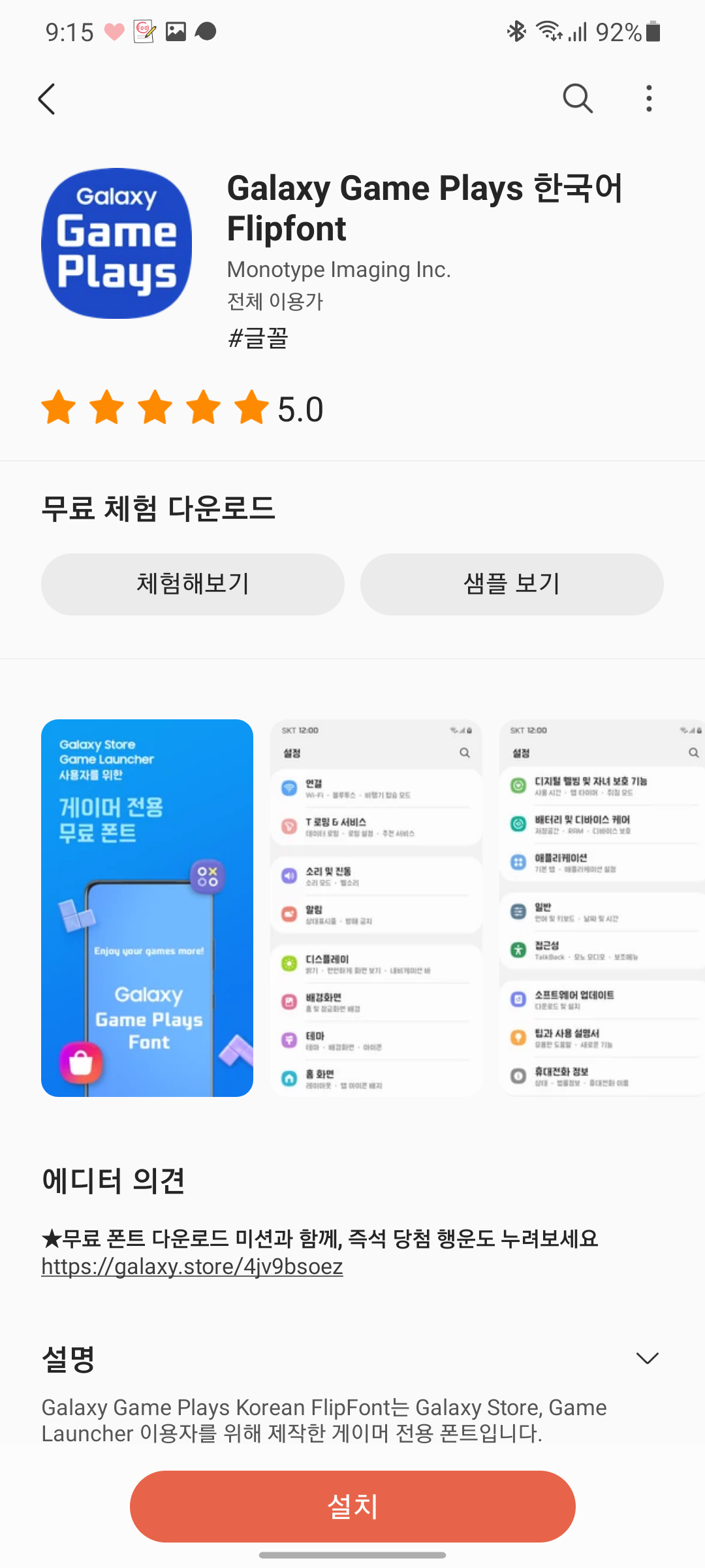 그럼 이렇게 Galaxy Game Plays 폰트 설치화면이 나타나는데요.