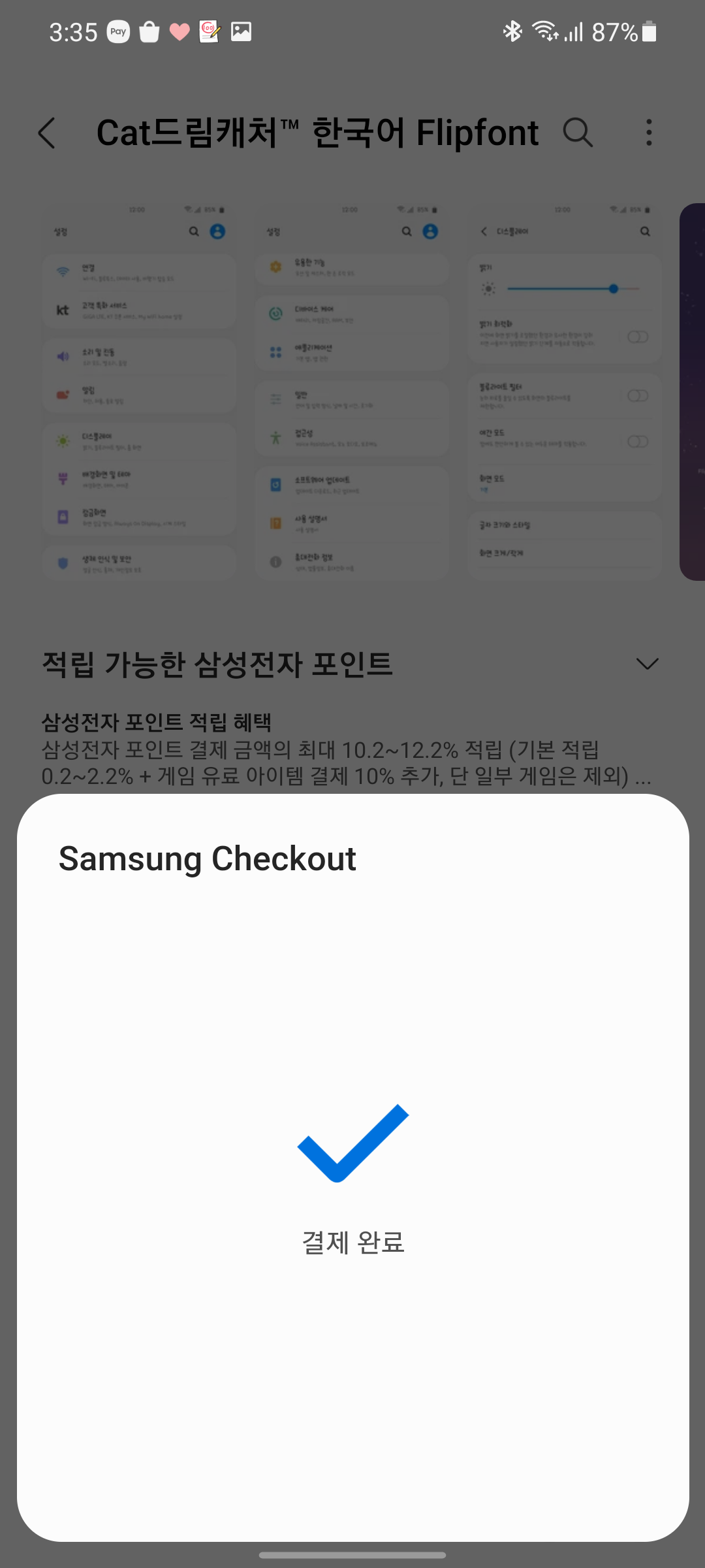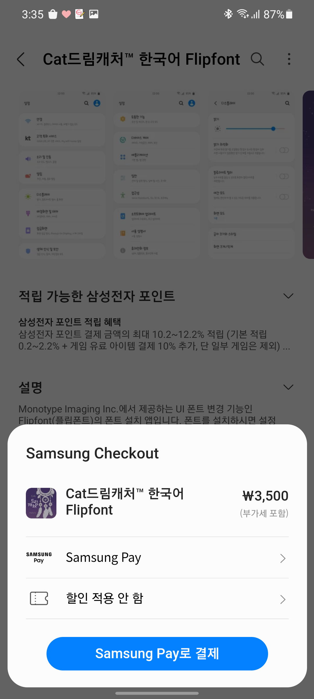 폰트 가격은 3,500원이구요. 저는 삼성페이로 간편하게 결제했습니다. 현재 드림캐처 폰트 구매시 캣폰트에서 카톡테마와 배경화면을 제공하는 이벤트를 진행중에 있다고 하니 참고해주시면 좋을 것 같습니다 😊