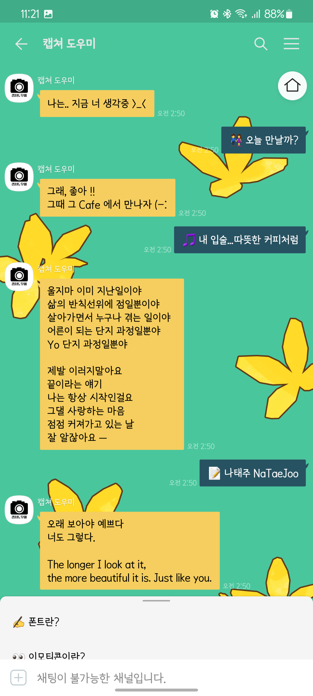 참고로 현재 TS font에서 TS개나리 폰트 출시 기념으로 무료로 다운로드 받을 수 있는 카톡테마를 공유중이니 마음에 드신다면 한번 사용해보셔도 좋을 것 같습니다. Android, iOS 모두 사용할 수 있는 테마입니다 :)