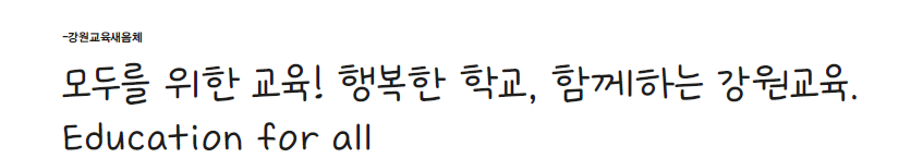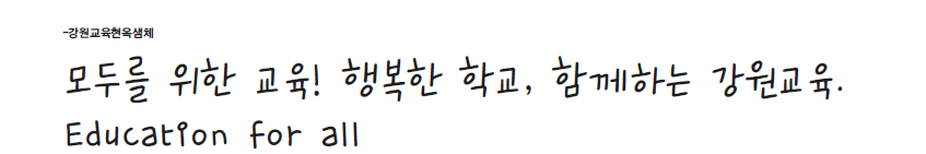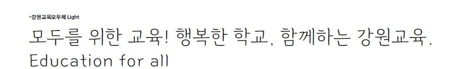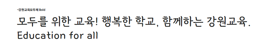 강원교육모두체(Bold)는 '모두를 위한 교육' 이라는 메시지가 담긴 강원도행복청의 공식 서체입니다. 굵은 폰트라서 표지제목이나 홍보물 제작에 활용하기 좋습니다.