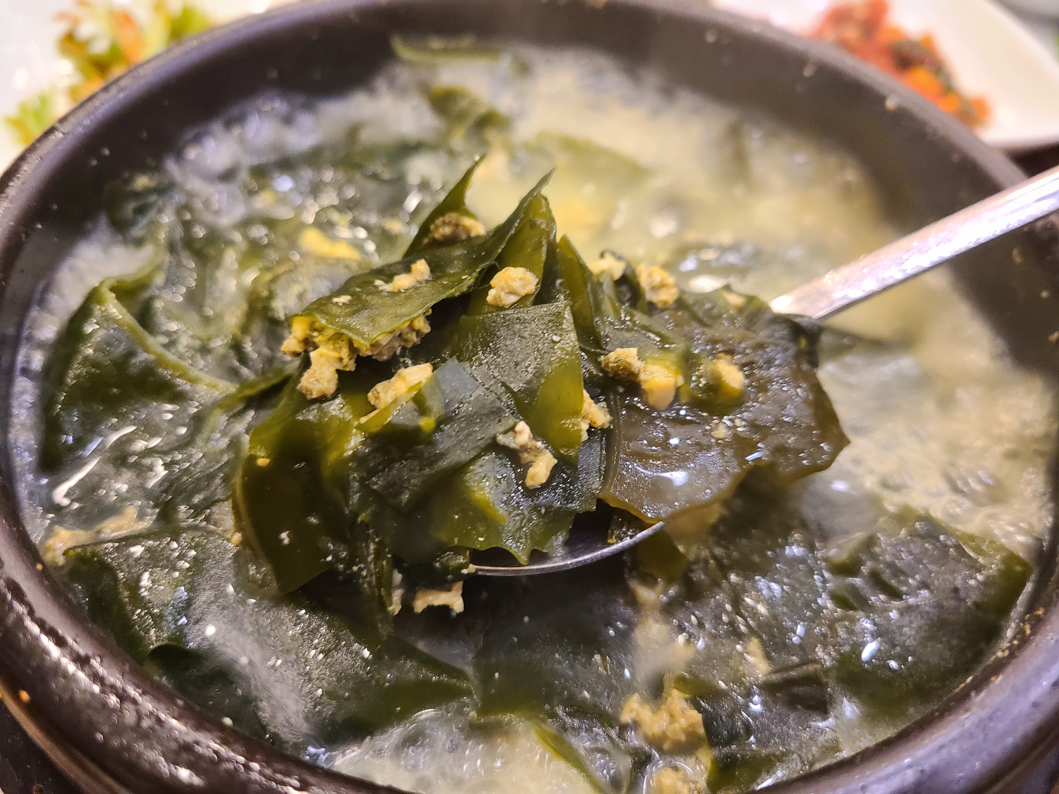 주문과 동시에 조리하기 때문에 펄펄 끓는 상태로 음식이 나옵니다. 대략 음식이 나오는 시간은 10분에서 15분정도 소요된 것 같습니다. 가자미 미역국에는 이렇게 통으로 가자미가 들어 있습니다. 생선이 들어가서 비린맛이 있지는 않을까 생각했지만 비린맛도 전혀 없고 담백한게 맛있었습니다. 가자미 미역국에도 기본적으로 조개살이 들어있습니다. 조개 모양 그대로 들어있는 것이 아니고 잘게 썰려진 조개가 들어있습니다.