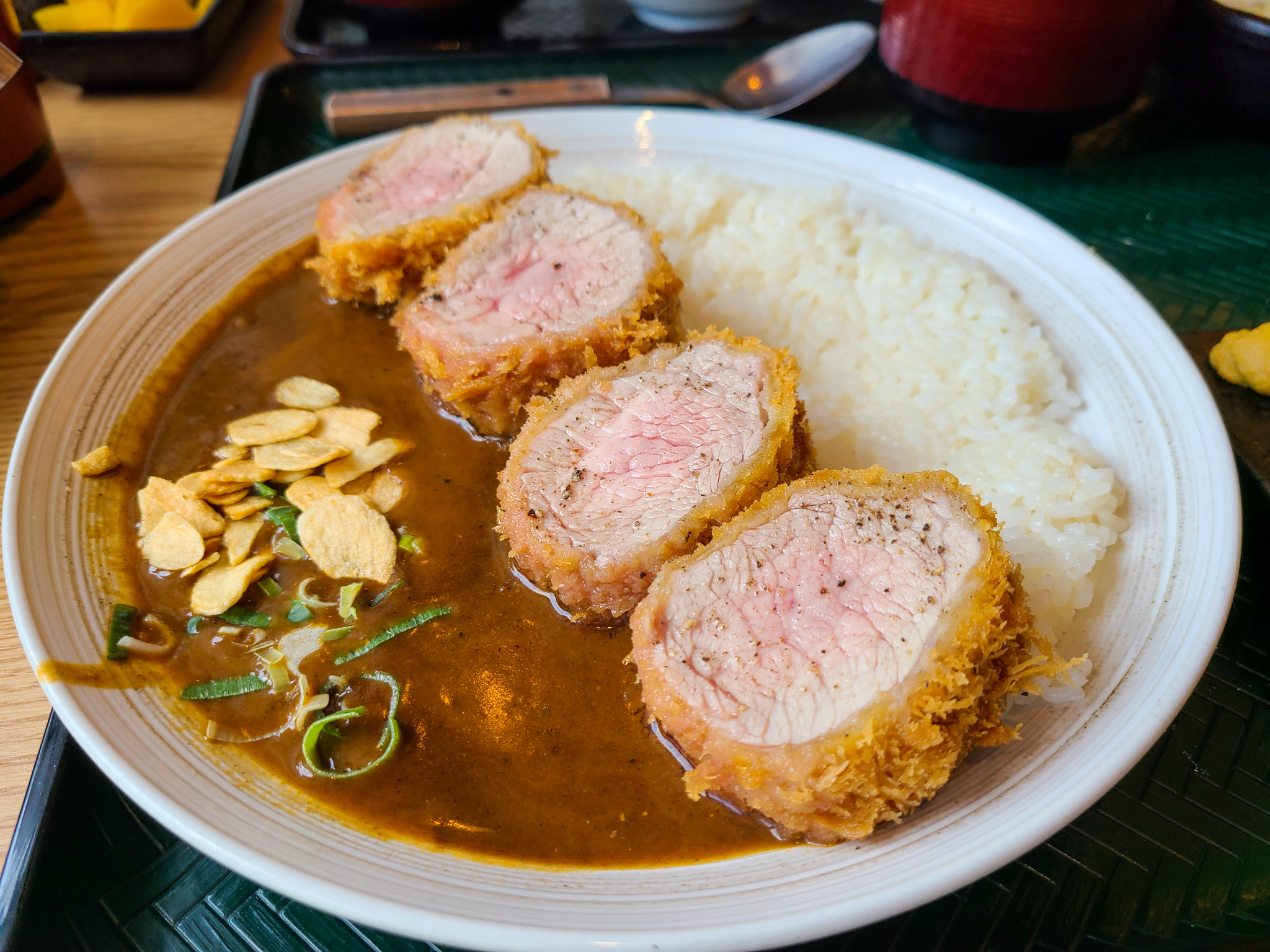 카레 안심 돈가츠는 총 4조각이 나오구요. 갈릭칩과 파가 얹어진 카레 반, 맨밥 반이 그릇에 깔려 있습니다.