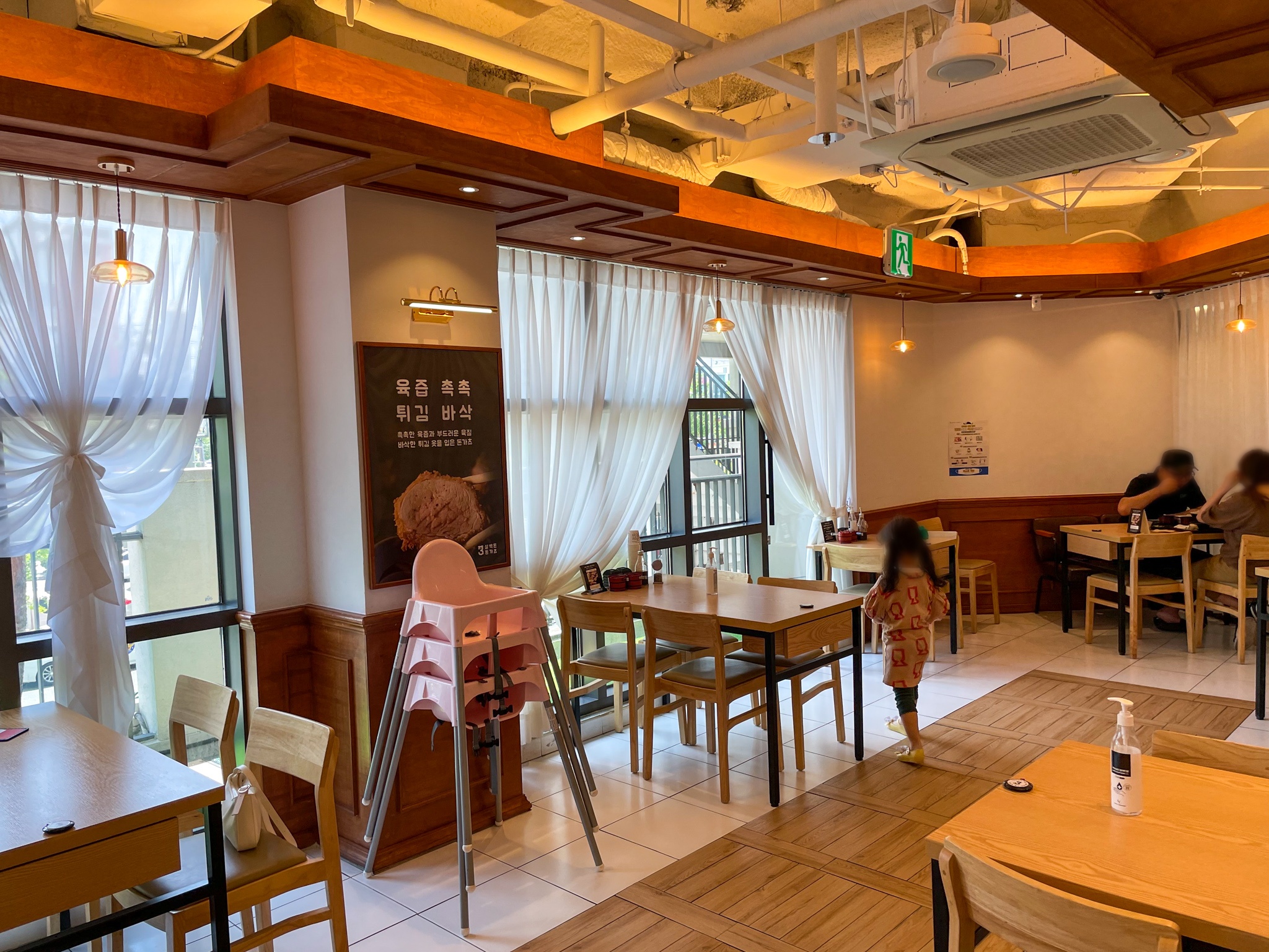 주로 4인 테이블이 놓여져 있구요. 좌석 간 간격이 넓어서 거리두기가 잘 되고 있습니다. 전체적으로 따뜻하고 밝은 분위기라서 편안하게 식사 할 수 있을 것 같습니다. 아기 의자가 여러개 준비되어 있어서 아이와 함께 오기도 좋습니다. 어디에 앉을지 고민하다가 저는 입구쪽에 있는 테이블에 자리를 잡았습니다.